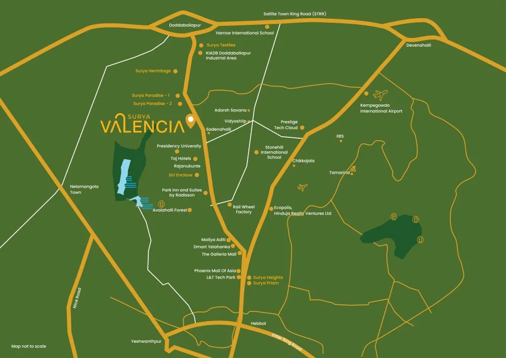 ocated near Yelahanka, North Bangalore, Surya Valencia Villas epitomizes luxury living harmonized with nature's tranquility. This residential marvel is meticulously crafted to offer a contemporary lifestyle embraced by lush greenery, sophisticated design, and modern amenities.